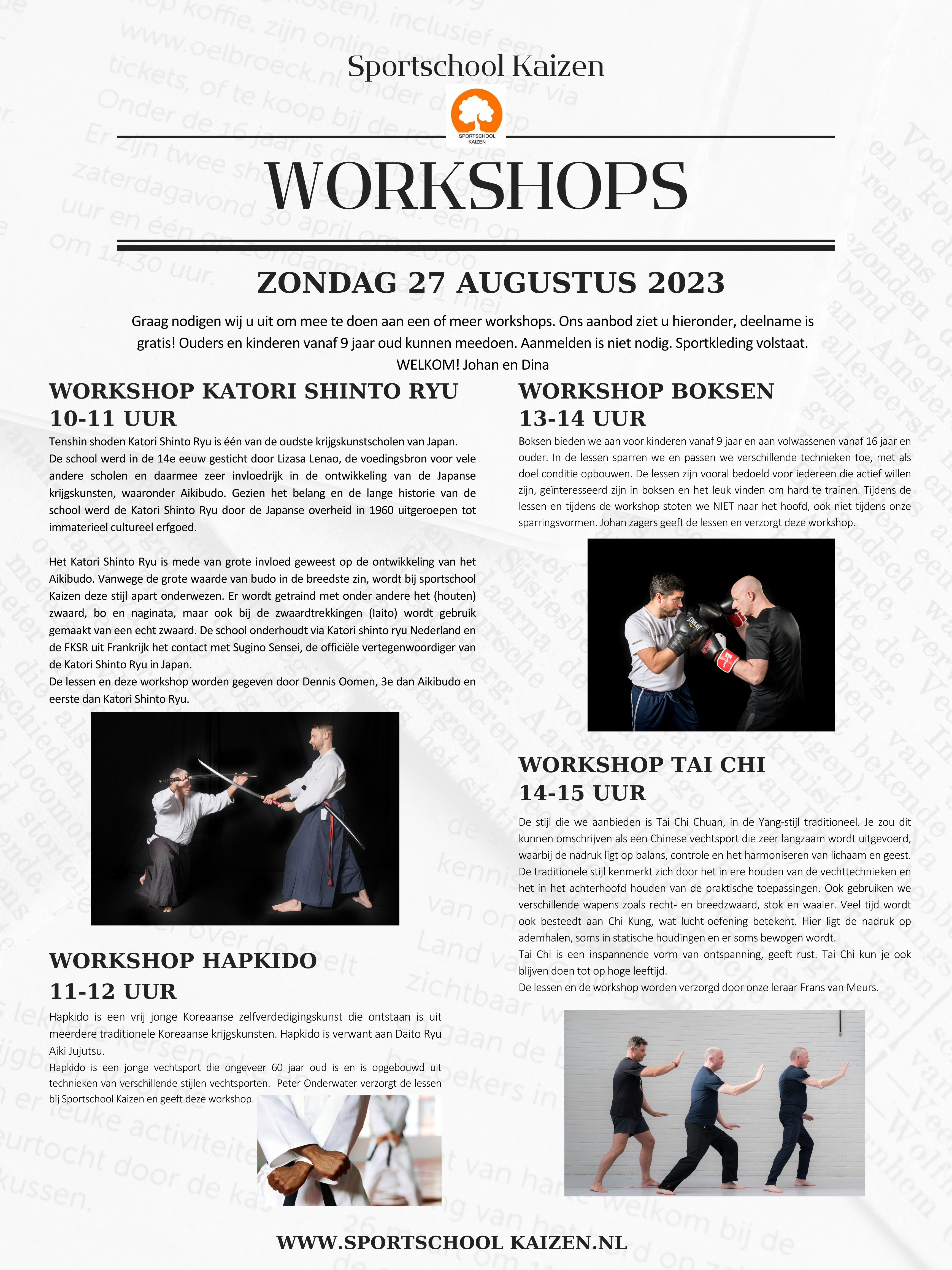 WORKSHOPS Graag nodigen we iedereen uit om een of meer workshops te volgen op zondag 27 augustus 2023. De vier lessen Katori Shinto Ryu (Zwaardvechten), Hapkido (Koreaanse vechtsport), boksen en Tai chi komen aan bod. Alle sporters, ouders, grootouders, broers, zussen en vrienden (kinderen vanaf 9 jaar en ouder) kunnen meedoen. Aanmelden vooraf is niet […]